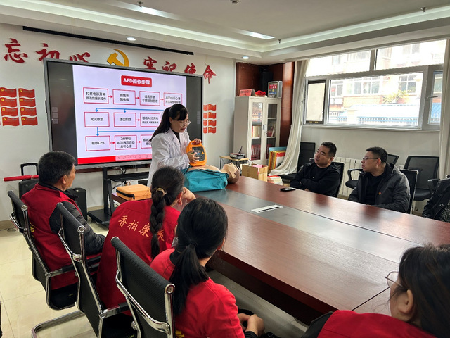 护理学院党总支刘俊和其他护理专业教师组成宣教团队,在社区中心为居民们开展急救知识技能宣教,结合现场实操教学,详细讲解了心肺复苏术和AED(自动体外除颤器)的操作方法和注意事项,让居民们掌握应急处置流程,提高应急处置能力。
